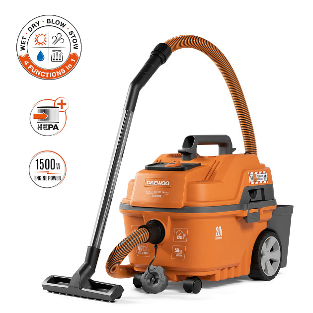 Электрический двигатель DAEWOO мощностью 1500 Вт в сочетании с высокопроизводительной турбиной обеспечивают разряжение 250 мбар и высокую производительность уборки.